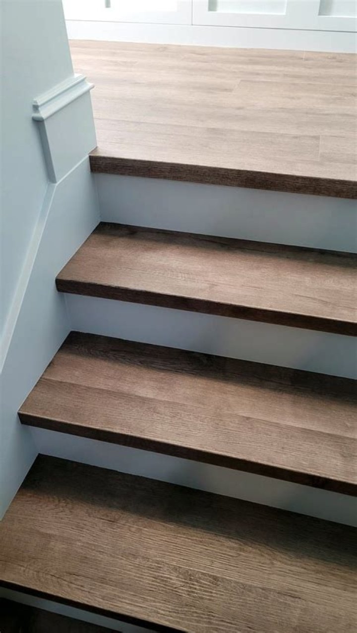 - Measure the length and height of the riser and cut a vinyl plank to fit.