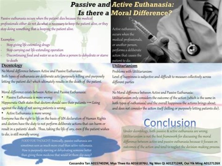 The moral difference between killing and letting die Many people make a moral distinction between active and passive euthanasia. They think that it is acceptable to withhold treatment and allow a patient to die, but that it is never acceptable to kill a patient by a deliberate act. Some medical people like this idea.