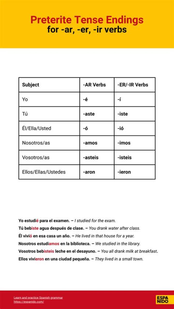 Does preterite mean past tense?PersonVerbs ending in -arVerbs ending in -er and -irtú-aste-isteél, ella, usted-ó-iónosotros-amos-imosvosotros-asteis-isteis
