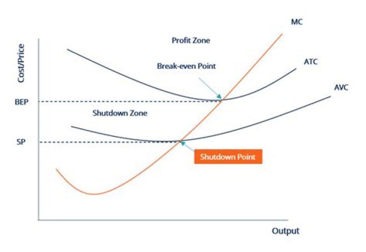 A shutdown arises when price or average revenue (AR) falls below average variable cost (AVC) at the profit-maximizing output level. Continued production will incur additional variable costs. In other words, they are costs that vary but will not generate enough revenue to cover them.