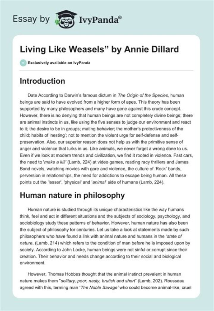 Annie Dillard’s essay entitled “Living Like Weasels” is an exploration into the way human beings might live, clearly stating that “We could live any way we want” (Dillard 211). … For instance, it is true that humans live lives of caution, with a certain fear that has been built up continually through the years.